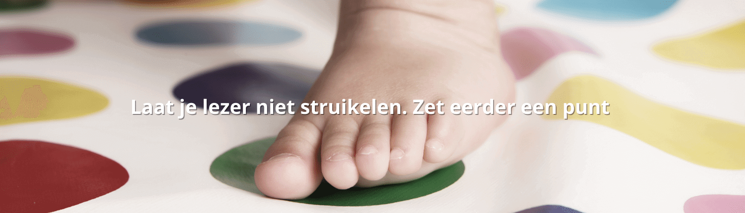 Zet vaker een punt. Dat is gemakkelijker gezegd dan gedaan. Waar plaats je bijvoorbeeld dit leesteken? Zet bijvoorbeeld een punt op de plek waar je nu een komma plaatst. Lezers zijn je dankbaar. Als je de tekst hardop voorleest, haal je adem op de plek waar de punt staat. Zo begin je zonder te hakkelen of te struikelen aan de volgende zin. Als je een samengestelde zin van hoofd- en bijzinnen opsplitst, begrijp je de boodschap ook beter.